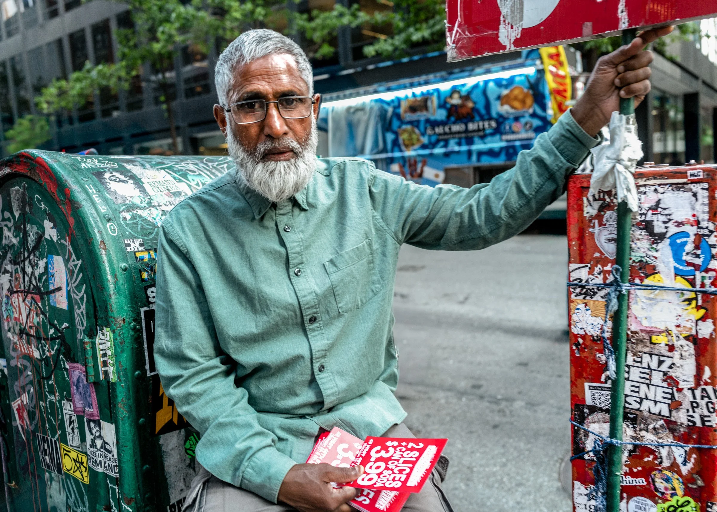 An elderly man with a gray beard and glasses sitting next to a graffiti-covered mailbox on a city street, holding red flyers in his hand.