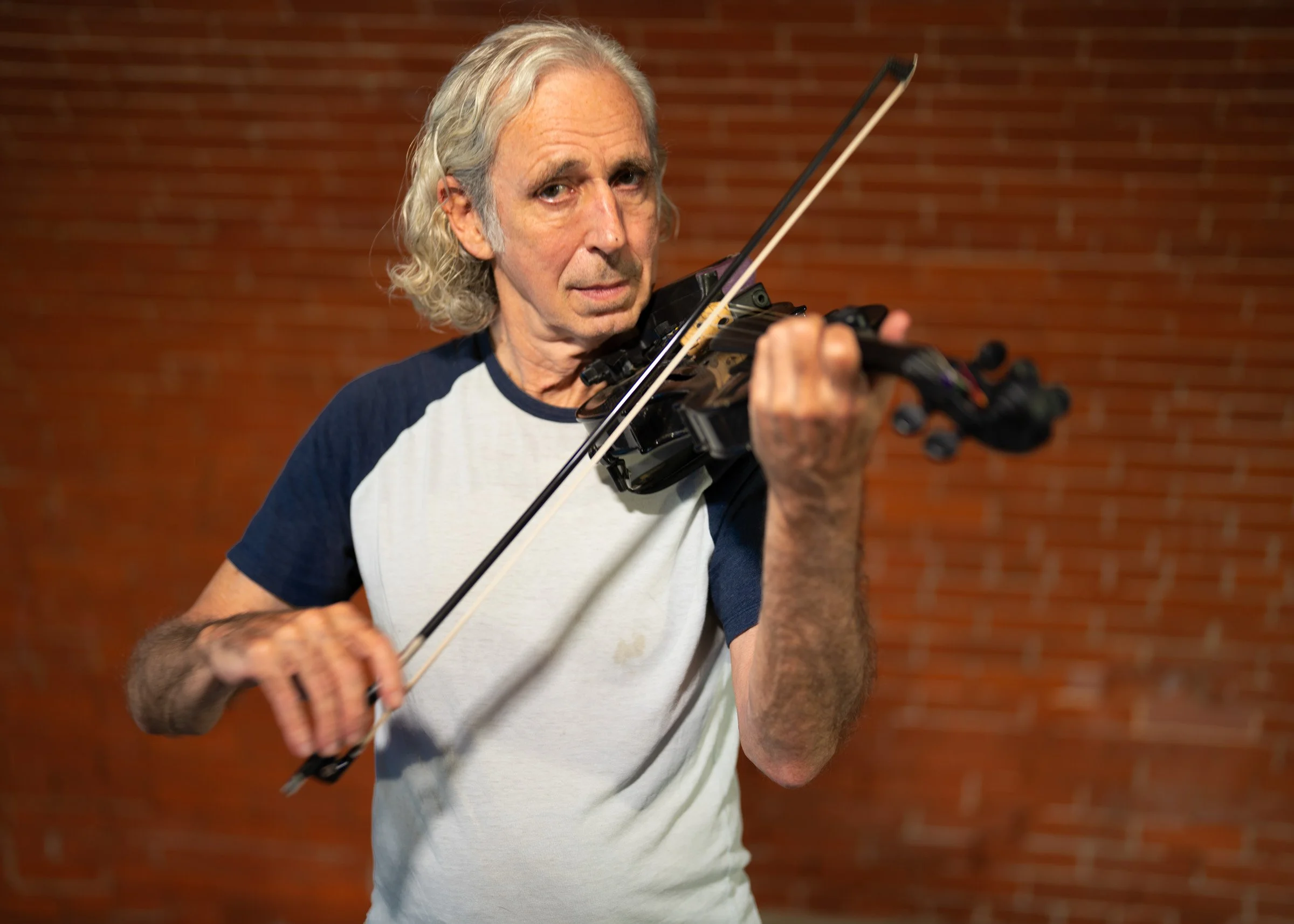 A man with curly hair and a mustache, wearing a hat and a vintage Yankees t-shirt, holding a phone, with a blurred city street background and people walking by.