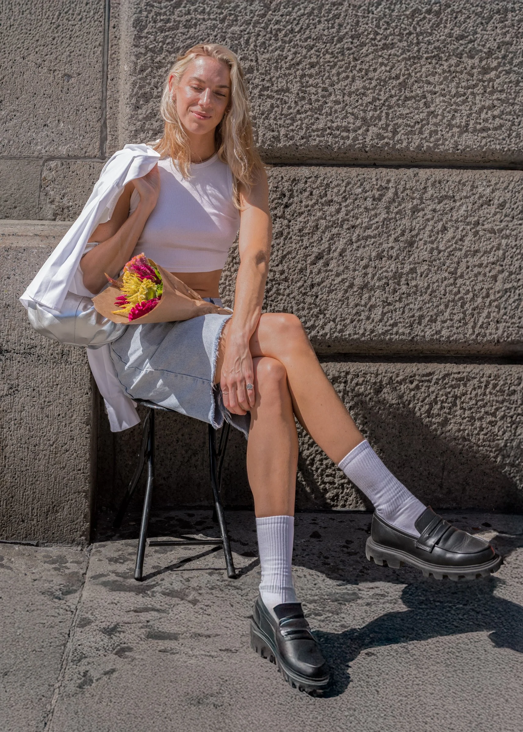 A young woman with blonde hair sitting outside on a black chair, holding a bouquet of pink and yellow flowers. She is wearing a white sleeveless crop top, a gray denim skirt, white socks, and black platform loafers. She has a white jacket draped over