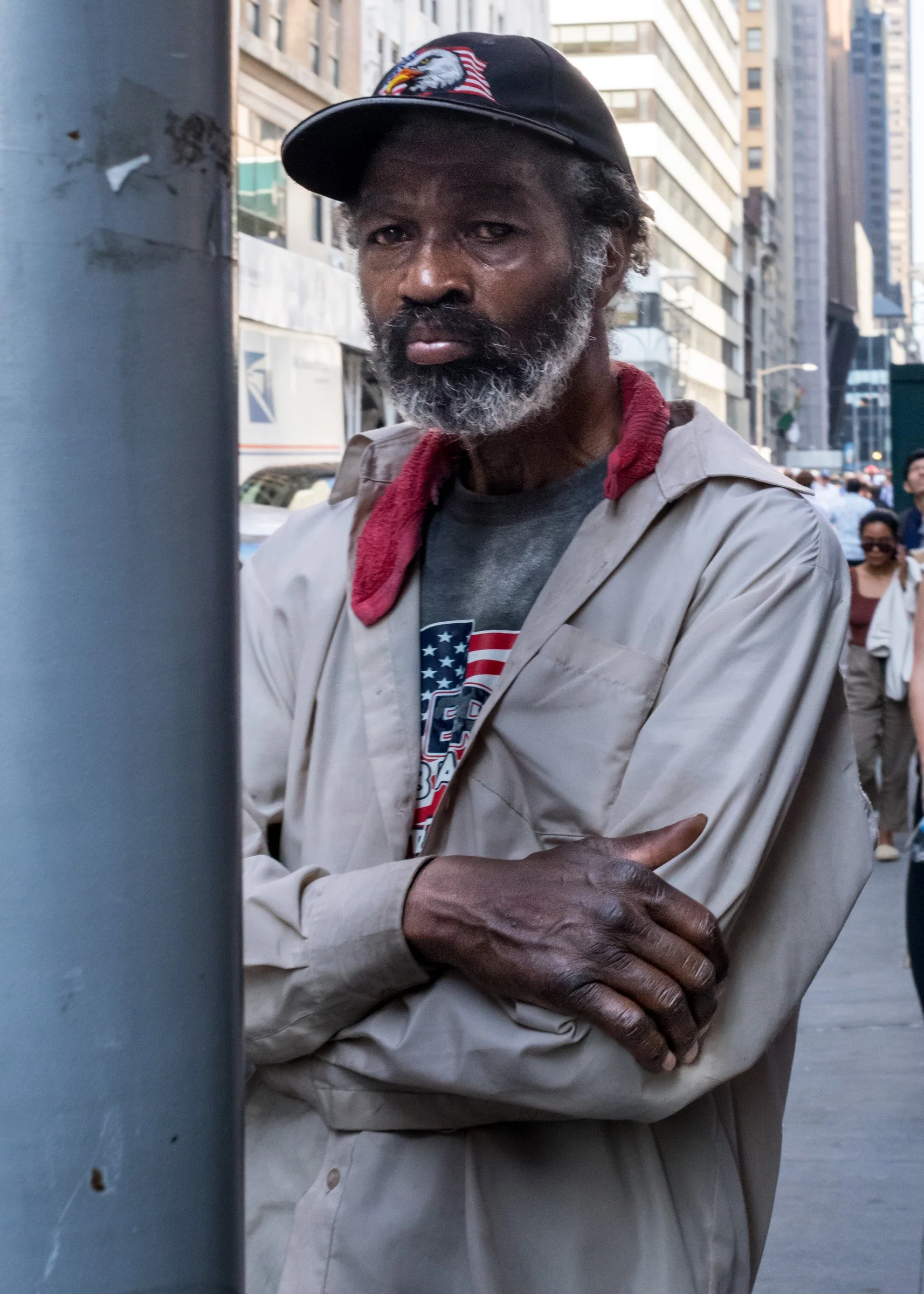 A man with a gray beard and mustache wearing a black baseball cap with an eagle emblem, a beige jacket, and a T-shirt, standing on a city street with tall buildings and people in the background.