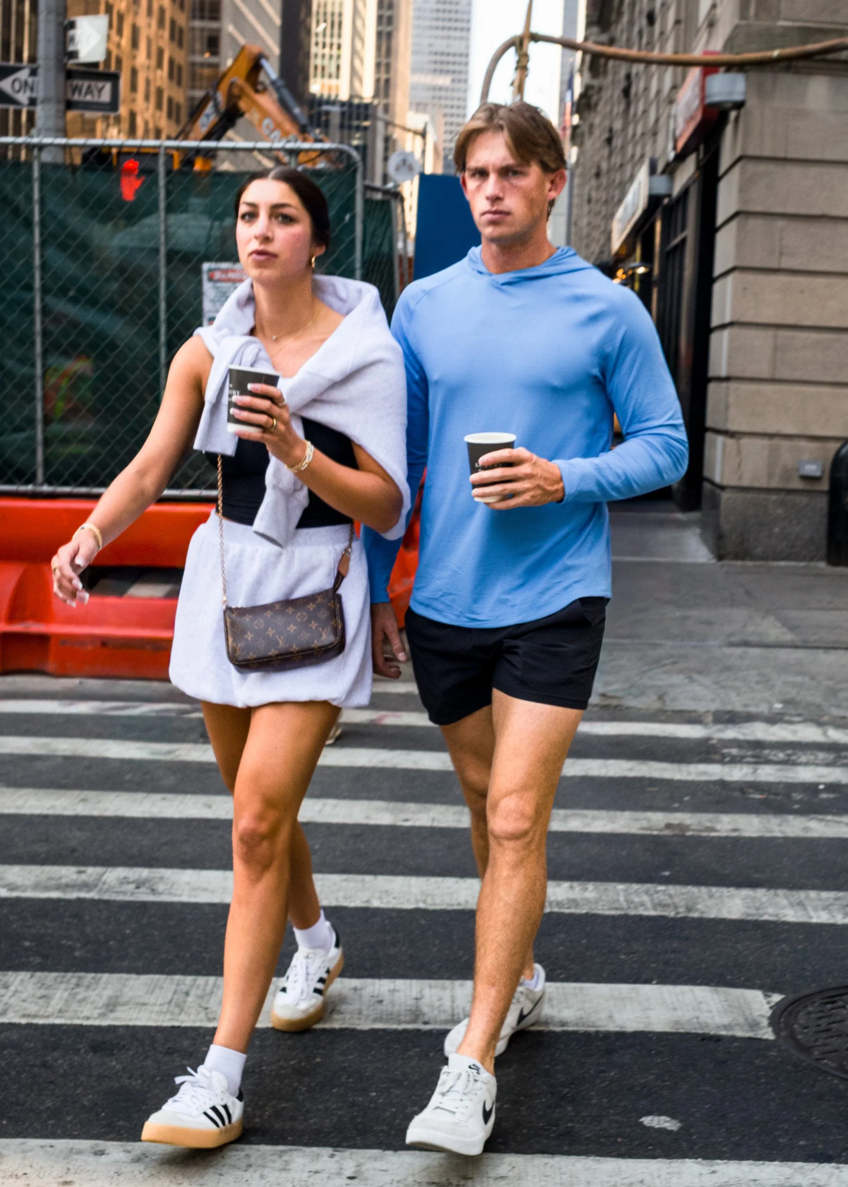 Two young adults, a woman and a man, walking across a city crosswalk. The woman is wearing a black dress with a gray sweatshirt tied around her shoulders, holding a coffee cup and a phone, with a Louis Vuitton purse slung over her shoulder. The man i