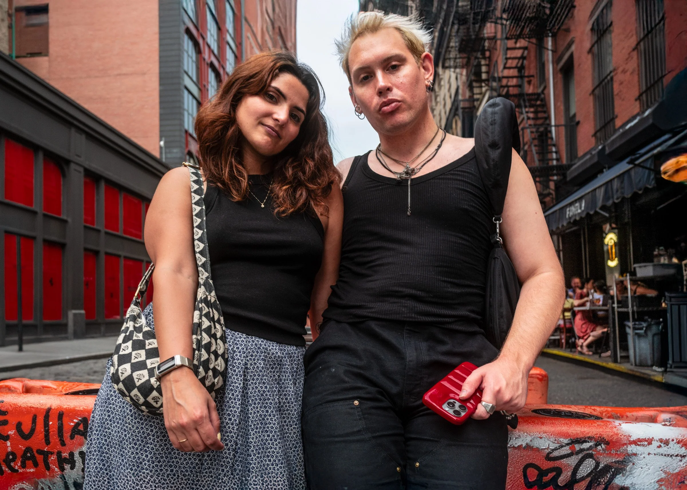 Two people standing close together outdoors on a city street. The woman on the left has shoulder-length brown hair, styled with loose waves, wearing a sleeveless black top, patterned skirt, and carrying a patterned bag. The person on the right has sh