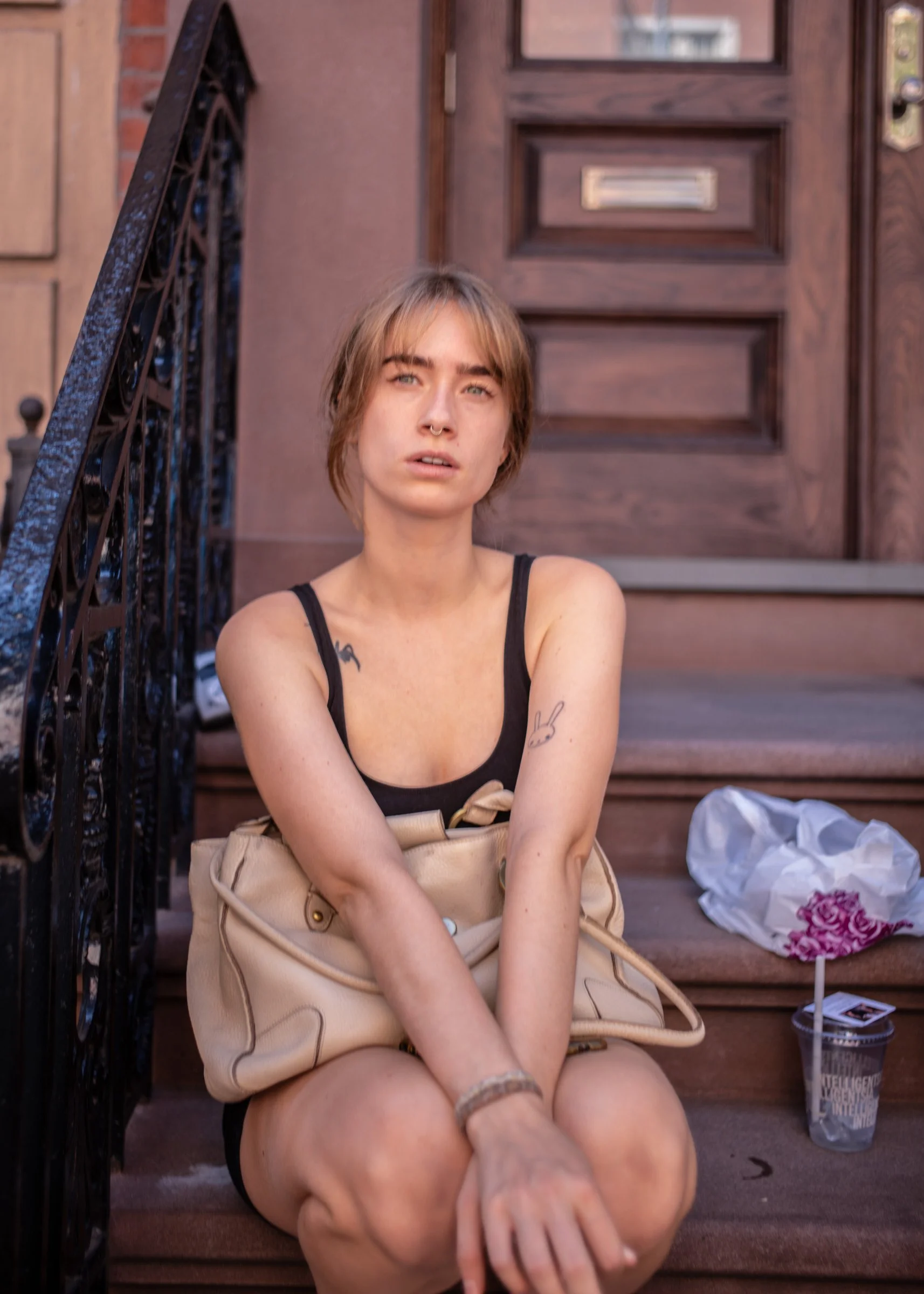 A young woman with short, light brown hair sitting on brown front stairs, wearing a black tank top, holding a beige purse, with a tattoo of a rabbit on her left arm and a small tattoo on her right collarbone. There is a plastic cup with a straw and a