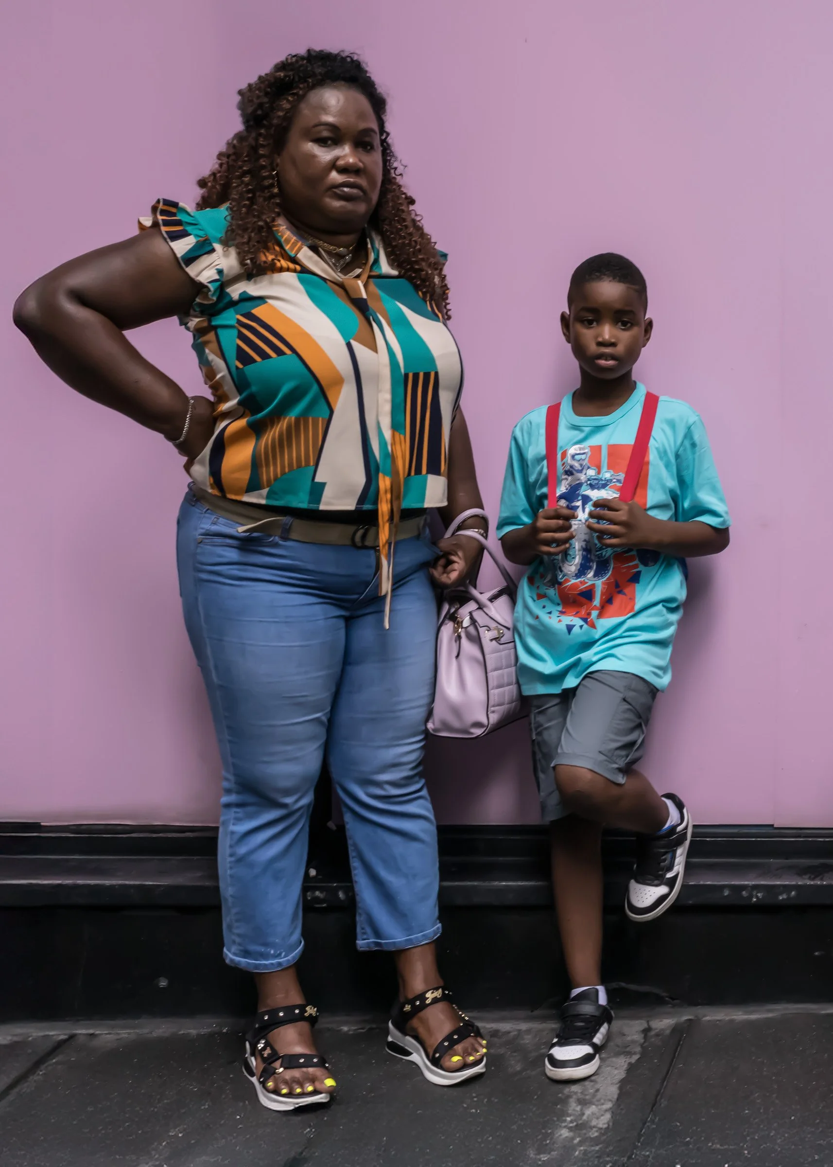 A woman and a young boy stand against a pink wall. The woman has curly hair and is wearing a colorful patterned shirt, blue pants, and black sandals. The boy has short hair, wears a blue t-shirt with a graphic and gray shorts, and holds a water bottl